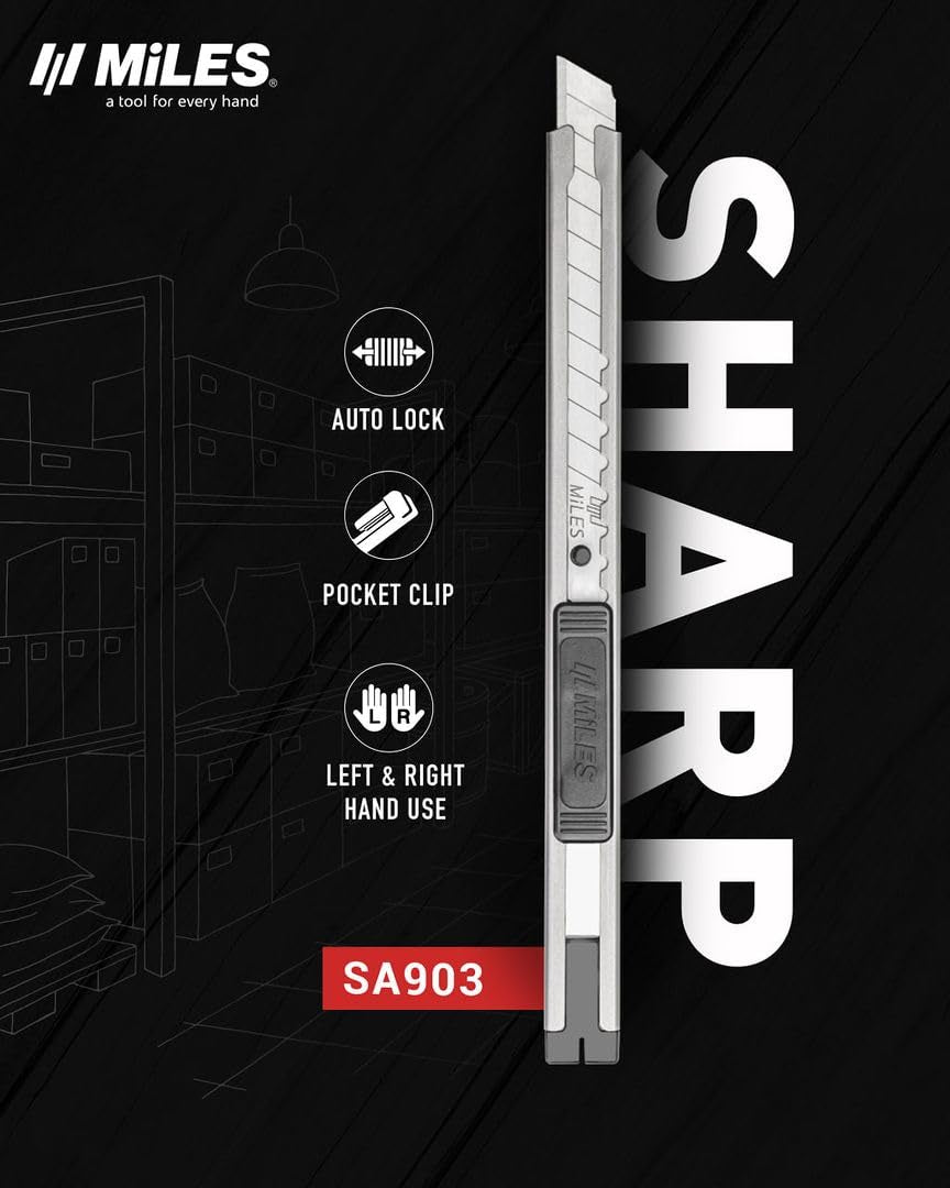 The Miles SA903Y is built for professionals who demand durability, precision, and safety in one compact tool. Featuring a stainless-steel body with pocket clip and snapper, this cutter is both sturdy and convenient to carry.